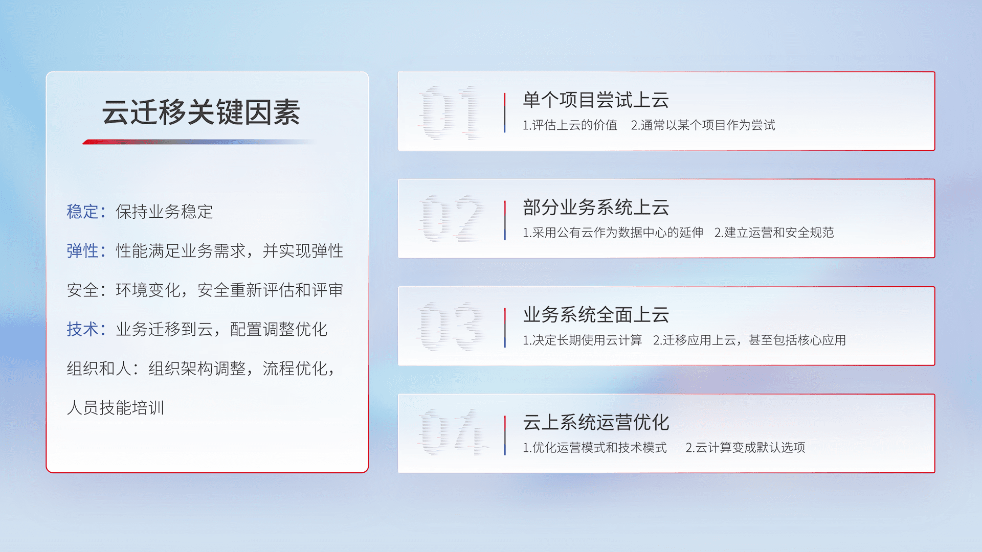 结合实际业务,,,从规划设计、、、、云平台选型、、、云原生改造、、、、数据迁移、、、、集成交付,,,,迁移全过程为客户识别最佳上云路径,,,做好风险识别管理,,设计网络架构、、、、身份权限、、、安全审计合规、、、、操作审计、、日志审计、、监控告警策略、、、、多站点容灾设计等,,,对云上基础设施进行整体规划,,提升IT治理水平,,,以满足弹性、、、、高可用、、、、高性能的需求。。