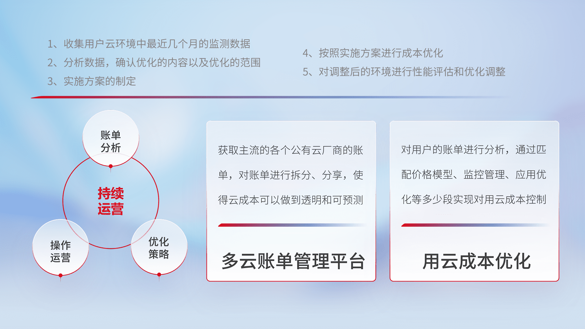 通过多云纳管,,,以统一的资源数据模型把客户的云资源进行抽象和封装,,,进而实现对多云资源的统一操作,,,,保障云资源管理的可靠性、、、、稳定性与可用性。。。量身定制化运维内容,,配置、、开发运维、、补丁管理、、备份、、监控、、、认证和访问管理、、、、审计和日常巡检等,,,,保障在用云过程中的可靠度,,,,稳定度以及高可用率。。。